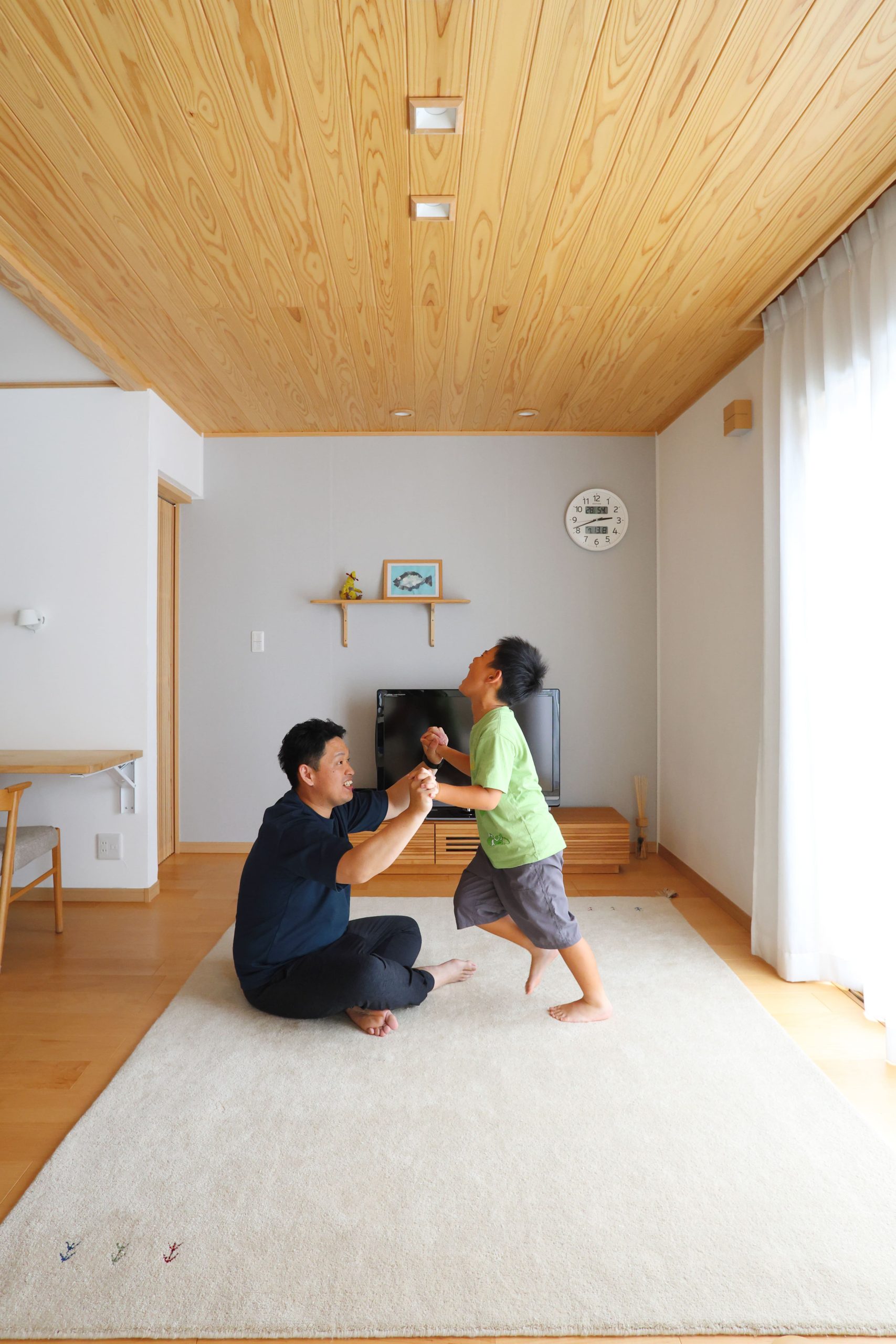 リビングの天井には木目が美しい無節のスギ板張りとし、テレビ台の奥の壁には金箔と銀箔入りの和紙を採用。夜に壁のブラケットのみ点灯させると、旅館のような非日常感が漂う。